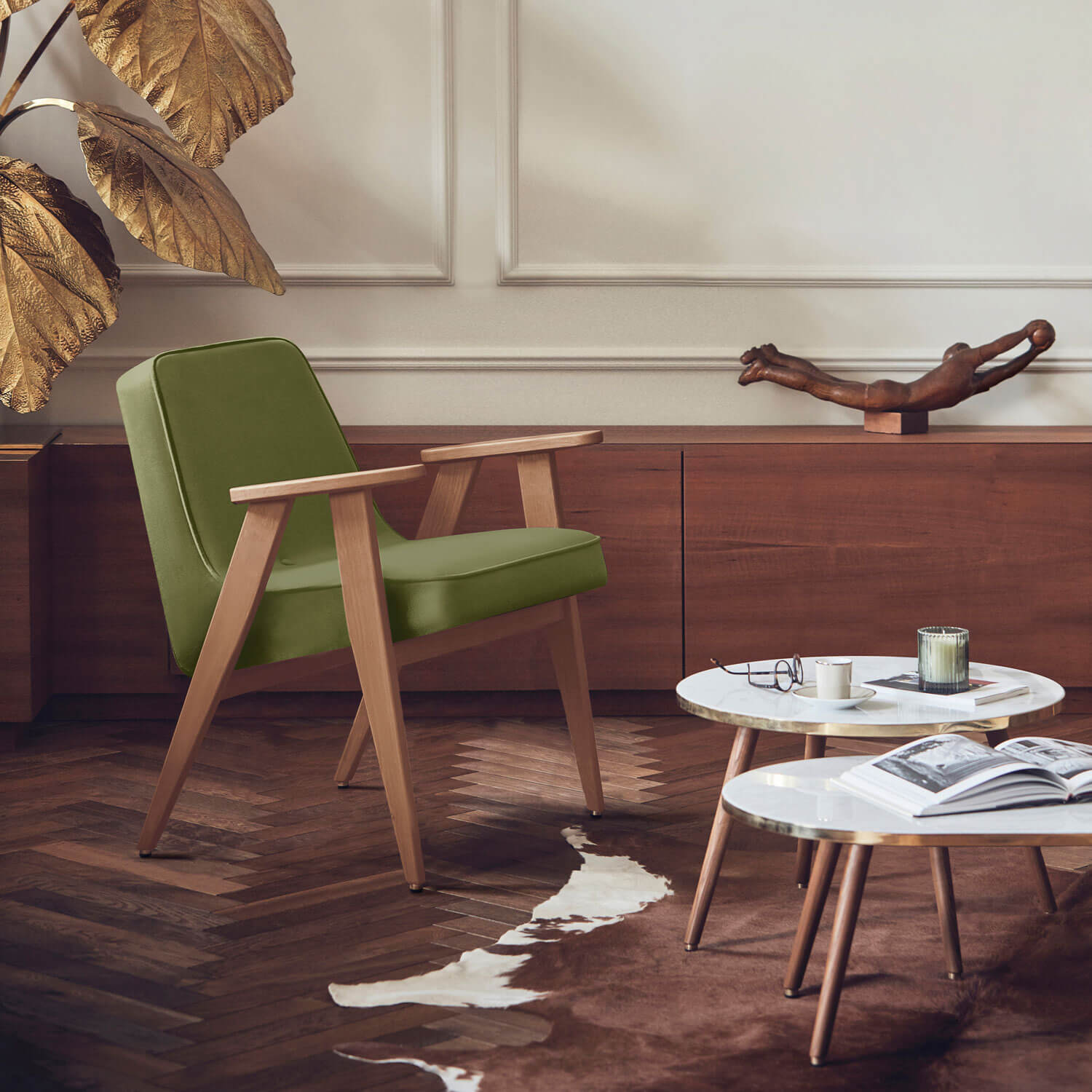 Wie wäre es mit einer Fußbank oder einem schönen Kissen, passend zu deinem neuen 366 Velvet Chair? Beides findest du in unserem Shop.