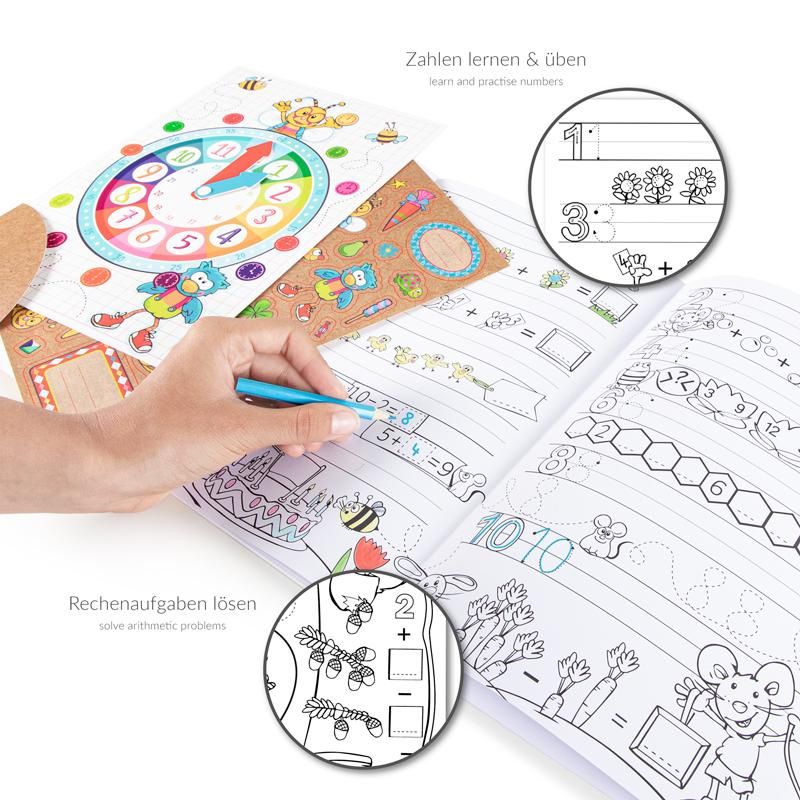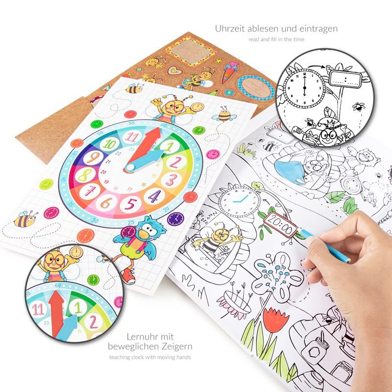Mit diesem Set aus Lern- & Ausmalspaß Aktivitäten für Buchstaben, Zahlen und Uhrzeiten auf drei großen, ausklappbaren Seiten macht das Lernen richtig Spaß! Auch kleine Rechenaufgaben sind durch die liebevollen Illustrationen leicht zu lösen. Die Lernuhr mit beweglichen Zeigern hilft zusätzlich, die Uhrzeit zu lernen und zu üben. Außerdem können Kinder die beiliegenden 40 Sticker nutzen, um die Seiten individuell zu verzieren und zu gestalten.