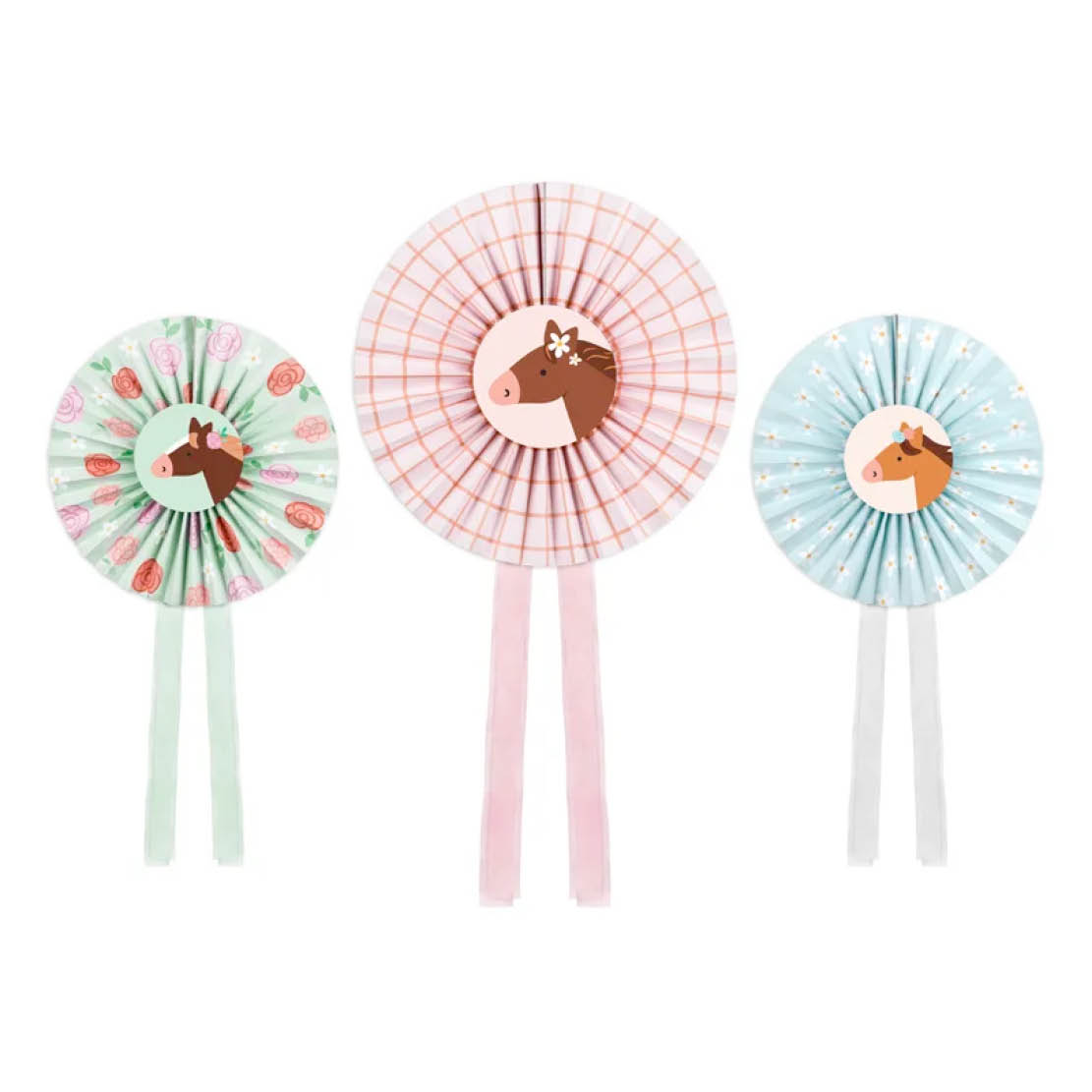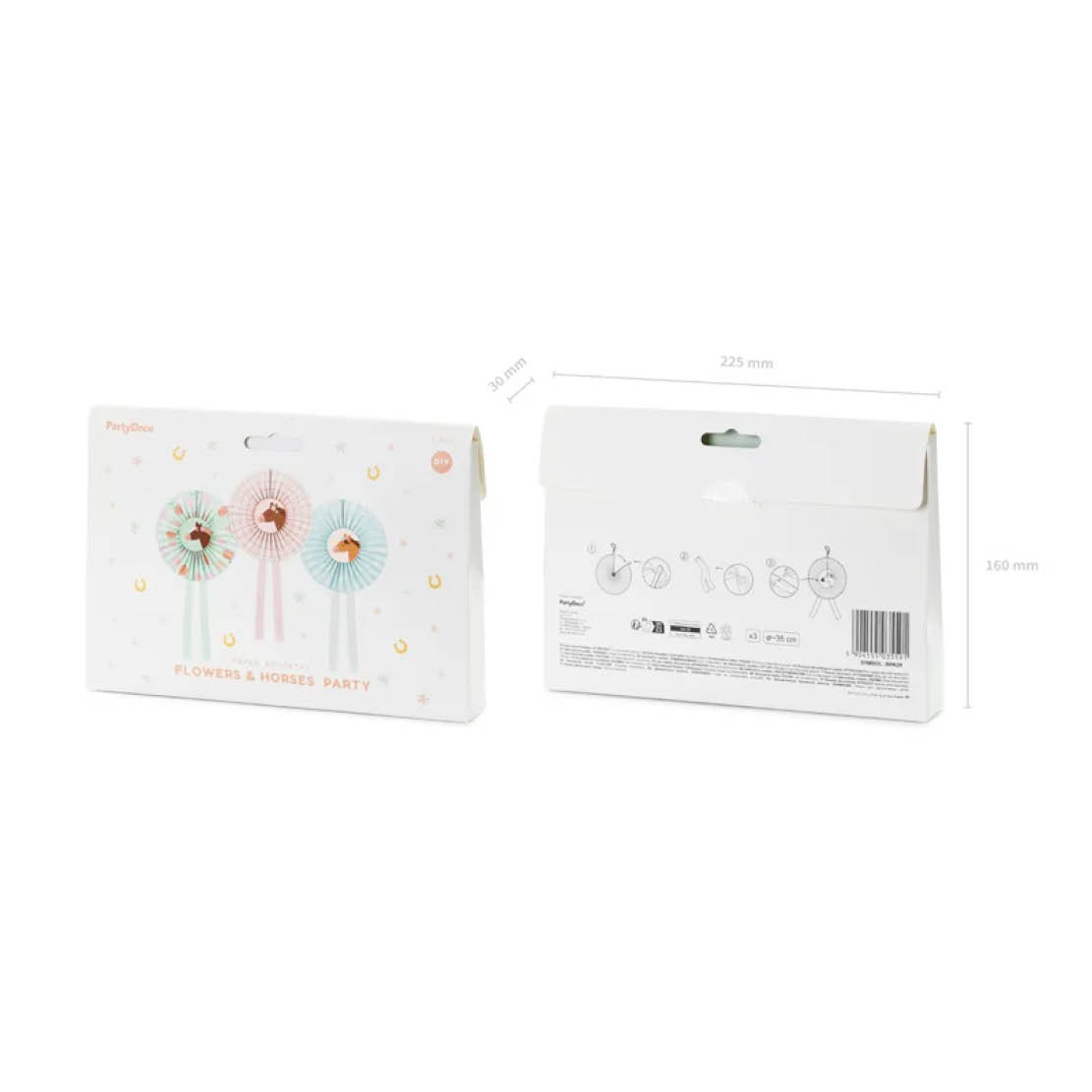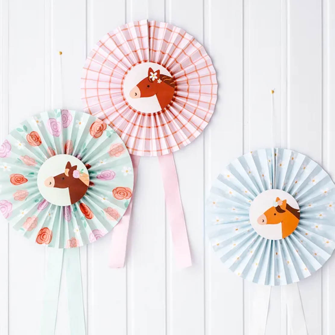 Eine Motto-Party ist nur dann gut, wenn auch die Dekoration auf das jeweilige Thema der Feier abgestimmt ist. Pferde Fans freuen sich deshalb über diese Blattrosetten mit niedlichen Pferdeköpfen. Sie können überall aufgehängt werden – ob an der Wand oder frei in der Luft baumelnd.