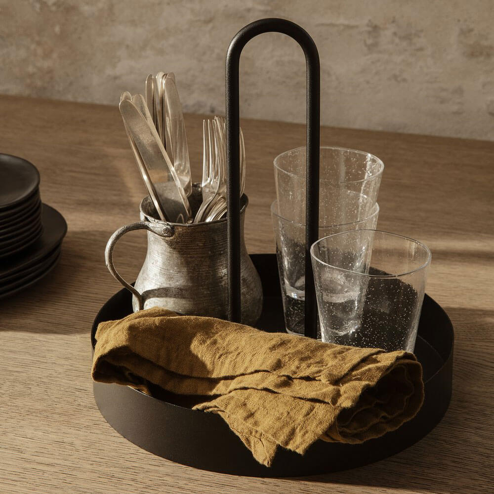 Mit dem Grib Tray im beliebten Schwarz zeigt das dänische Designlabel seine Leidenschaft für authentisches und funktionales skandinavisches Design. Es misst Ø 28 x H 28,7 cm. Beeindruckend ist der formvollendete Look. Rundungen bestimmen das Design des Tabletts. Die ovale Form spiegelt sich im Griff wieder, der beim Tragen bequem in der Hand liegt. Ferm Living empfiehlt zur Pflege, das Tablett mit einem feuchten Tuch abzuwischen.