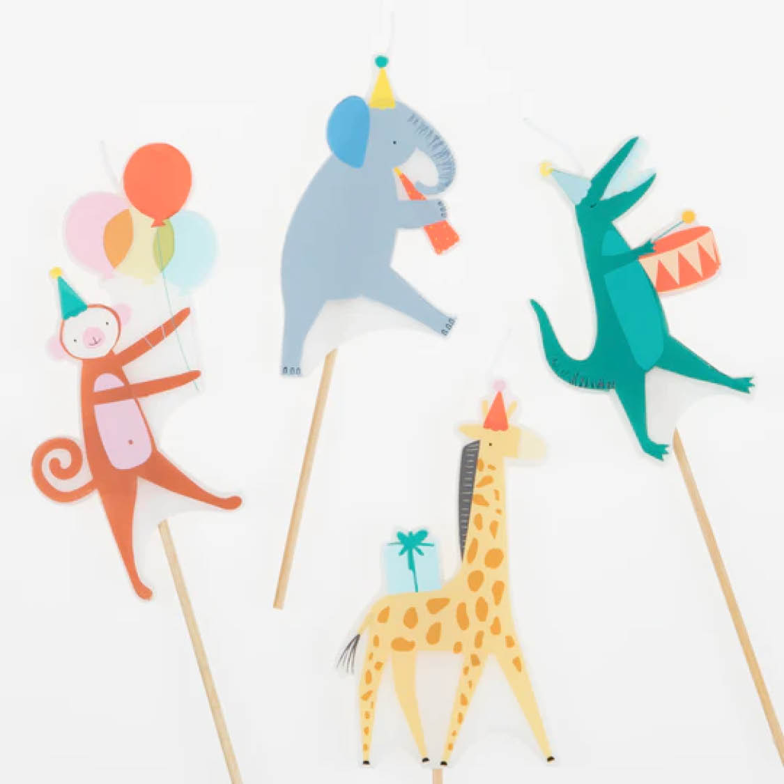 Die niedlichen Kerzen aus der „Tier-Parade“ sind die perfekte Dekoration für eine Geburtstagstorte oder große Cupcakes. Wo auch immer sie zum Einsatz kommen: Der Elefant, das Äffchen, die Giraffe und das Krokodil sind in jedem Fall in Partylaune und versprühen gute Laune, wenn sie ausgepustet werden!
