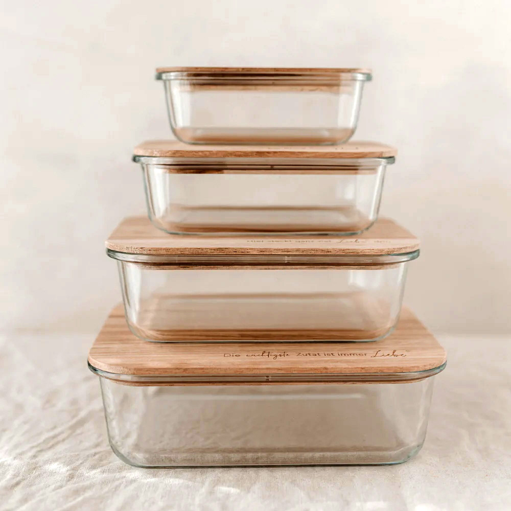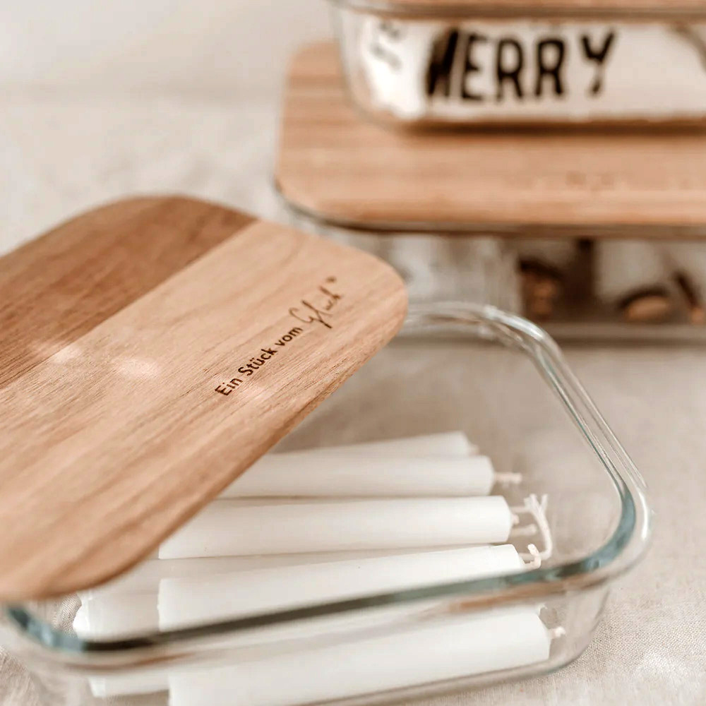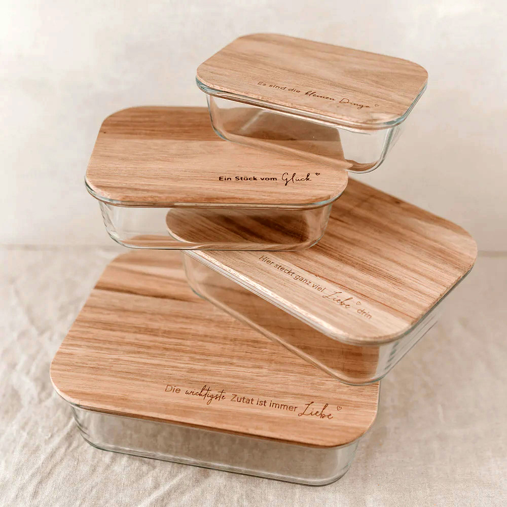 So schön geht Aufbewahren nur mit Eulenschnitt: Die hochwertigen Vorratsbehälter bestehen allesamt aus strapazierfähigem Borosilikatglas und werden – wortwörtlich – nur noch von dem stilvollen Deckel aus unbehandeltem Akazienholz „getoppt“. Dieser stellt dank des eingravierten Spruchs einen besonderen Blickfang dar und ist aufgrund seines Materials zudem ein echtes Unikat. Das Glas ist übrigens nicht nur äußerst beständig, sondern auch zu 100% recycelbar.