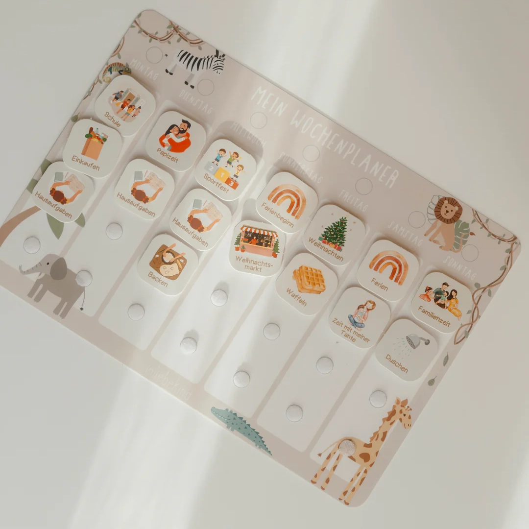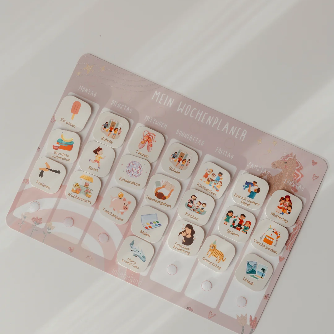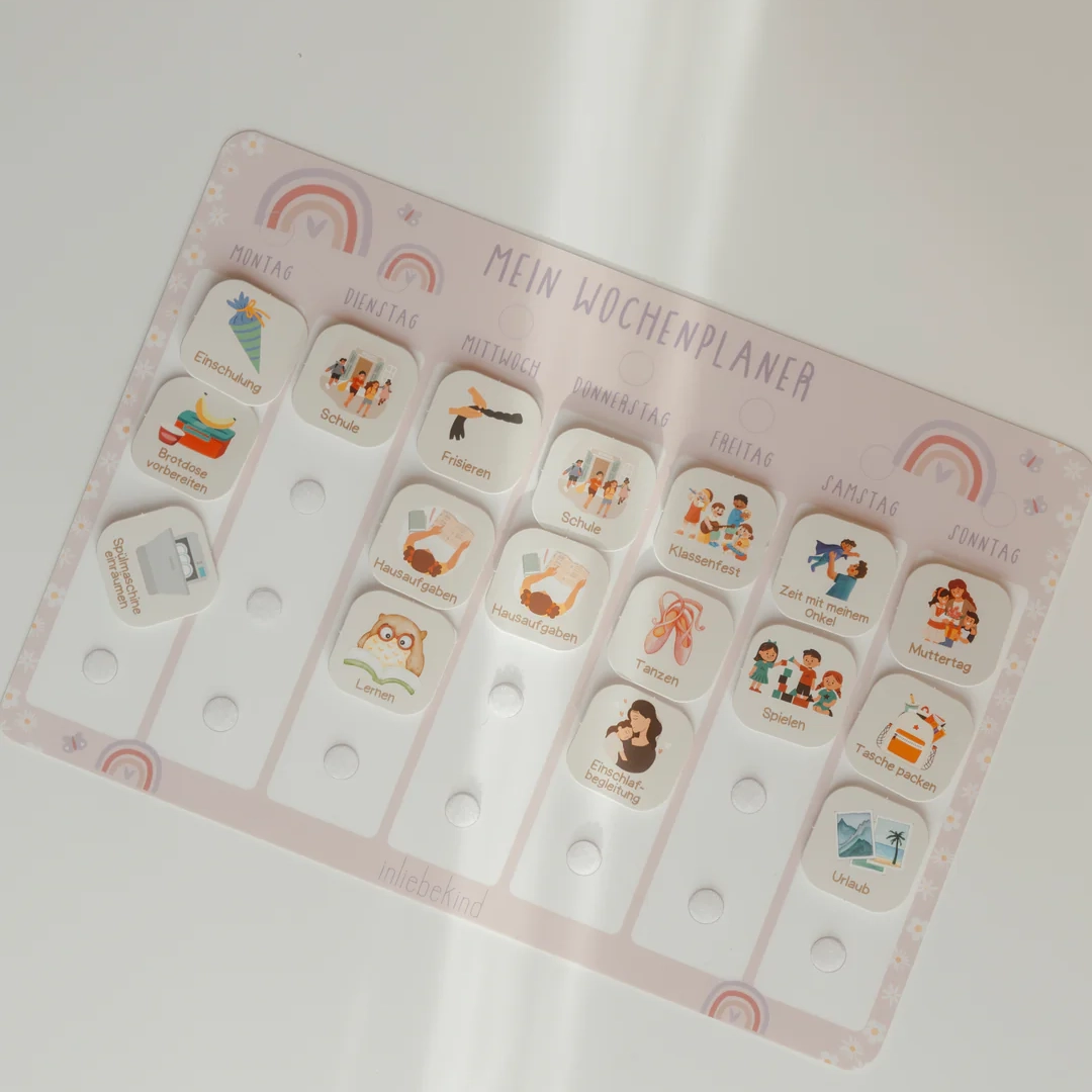 Mit dem Wochenplaner von inliebekind wird die Organisation des Alltags für Kinder spielerisch und interaktiv. Der Planer hilft dabei, eine feste Struktur zu schaffen, und fördert gleichzeitig die Selbstständigkeit und Organisationsfähigkeit der Kleinen.