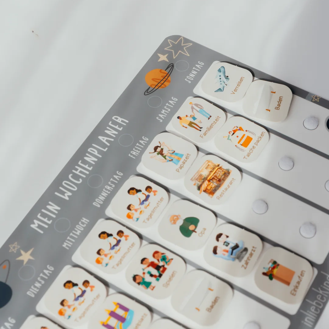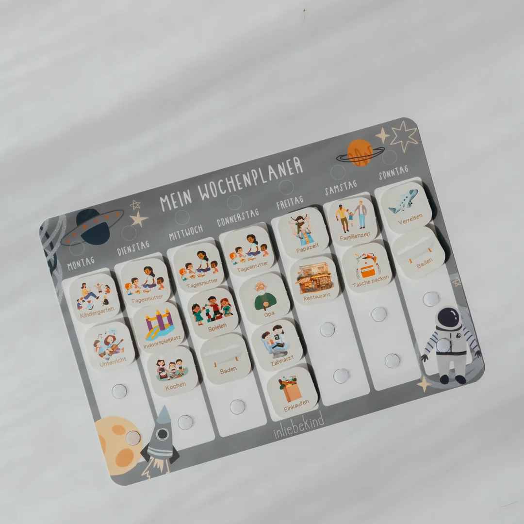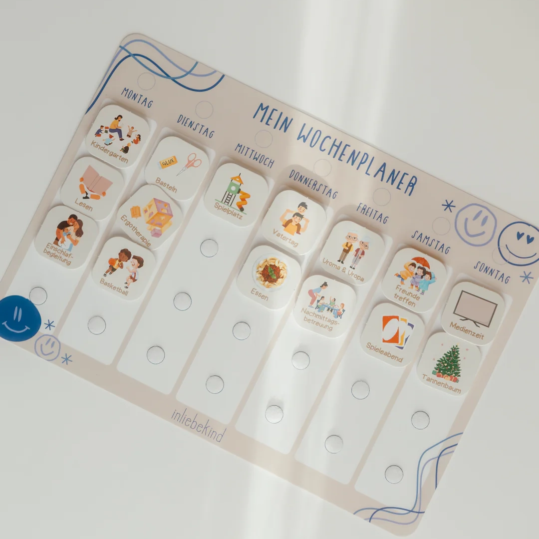 Mit dem Wochenplaner von inliebekind wird die Organisation des Alltags für Kinder spielerisch und interaktiv. Der Planer hilft dabei, eine feste Struktur zu schaffen, und fördert gleichzeitig die Selbstständigkeit und Organisationsfähigkeit der Kleinen.
