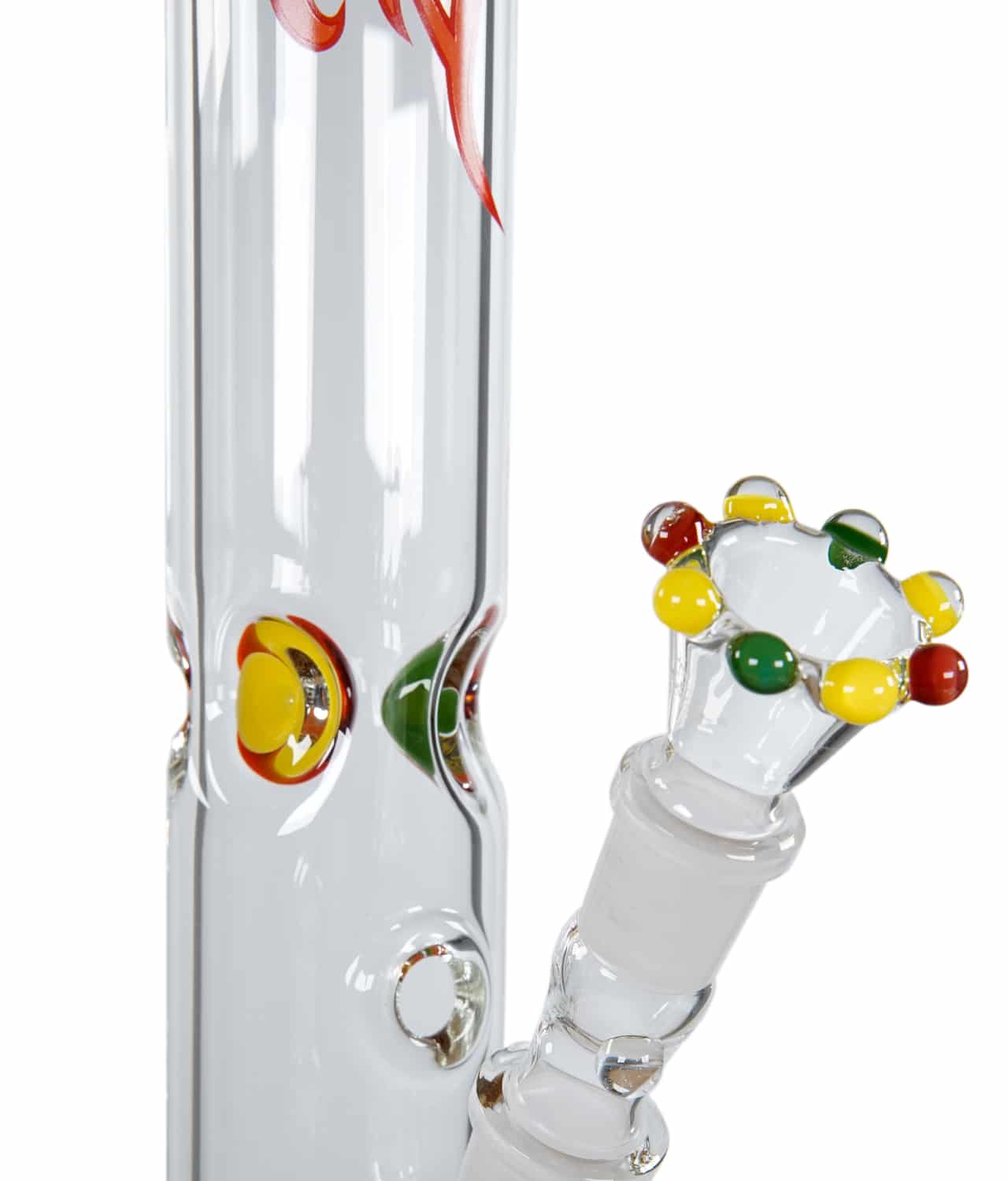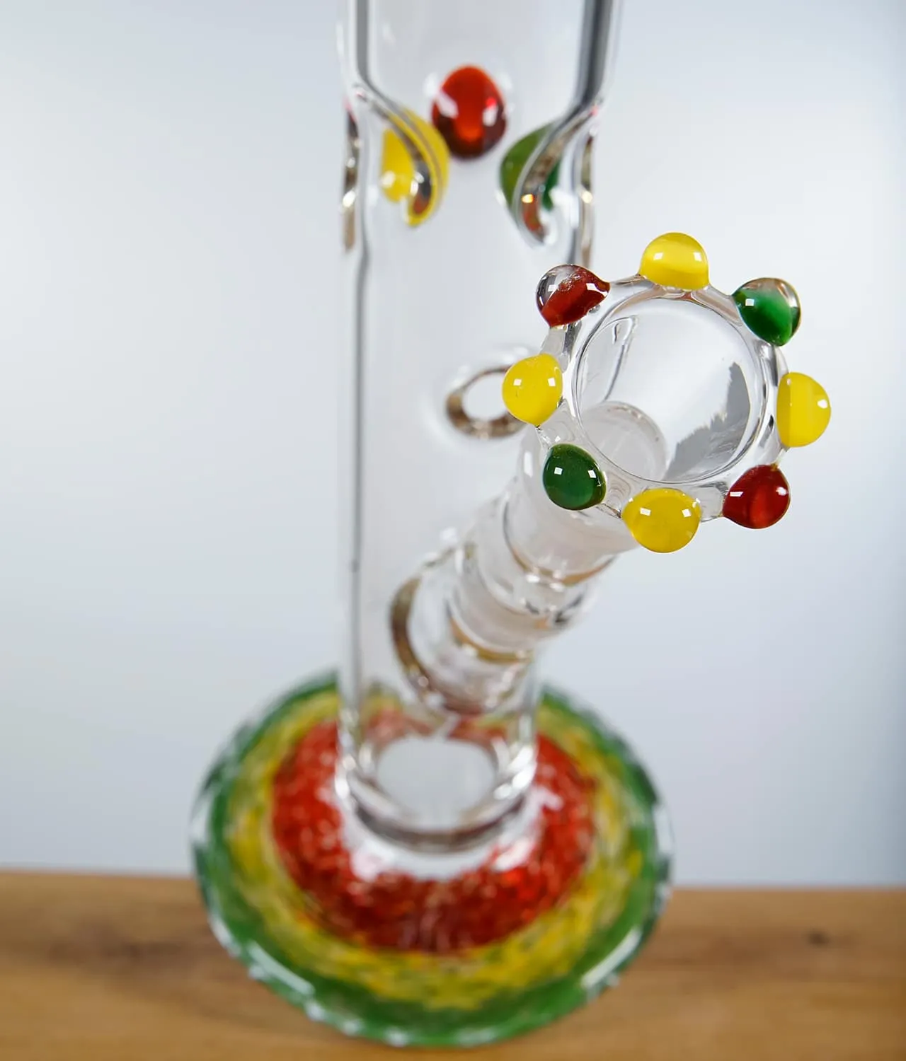 Zenit Glasbongs zeichnen sich durch höchsten Qualitätsstandard und deutsche Handwerkskunst aus, besonders die Zenit Glasbong 5 mm Eis in Rastafarben. Diese klassische Bong hat eine Wandstärke von stolzen 5 mm und eine Höhe von 50 cm. Der Rundfuß ist mit Farbgranulat in den Farben Grün, Gelb und Rot – also den Rastafarben – gefertigt und sorgt für eine super Optik mit Stabilität dank des Rundfußes. Diese Farben lassen sich auch in der Krone des Siebkopfes, der Krone am Mundstück und an den Eisdornen wiederfinden und erschaffen durch diese farbliche Kontinuität eine wunderschöne Bong. Im Lieferumfang enthalten ist zudem ein Lochdiffusor-Chillum mit Kupplung, welches perfekt im NS19 Schliff der Bong sitzt und für ausreichend Filtration sorgt.