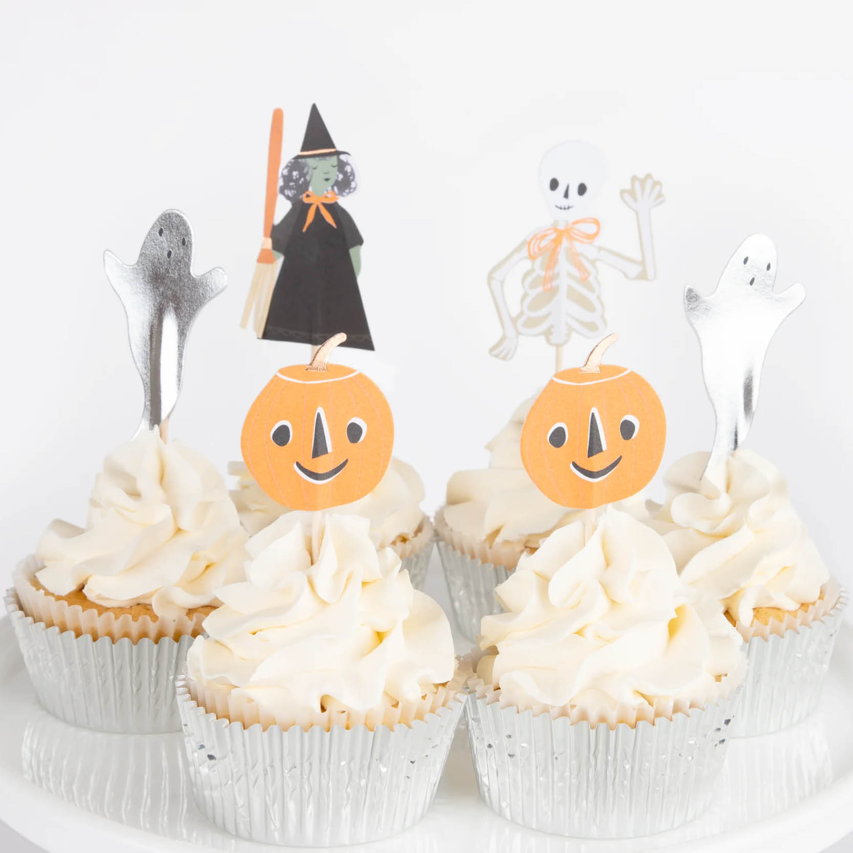 Mit dieser liebevollen Halloween-Verzierung von Meri Meri schmecken die Cupcakes gleich noch besser – und passen optimal zur Halloweenparty! Die Cupcake Themen-Topper kommen mit hübschen Illustrationen im Grusel-Design daher und lassen sich einfach auf den Cupcakes platzieren.