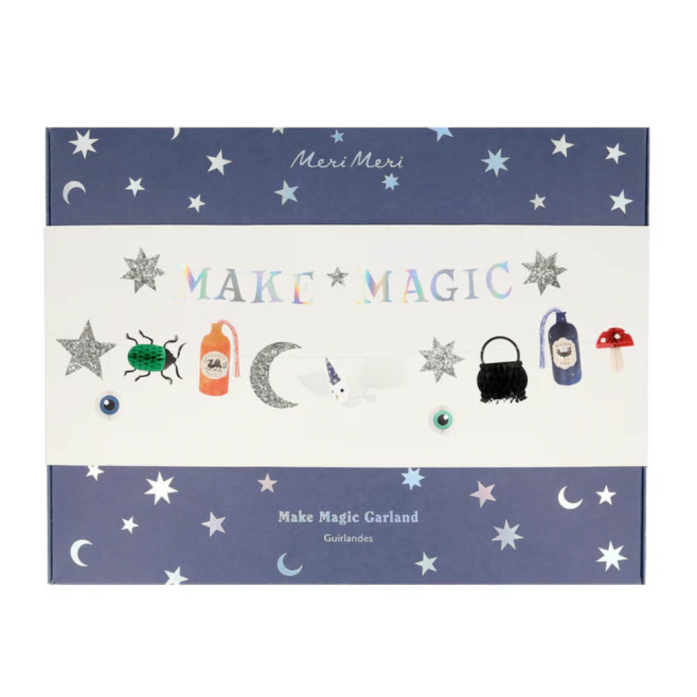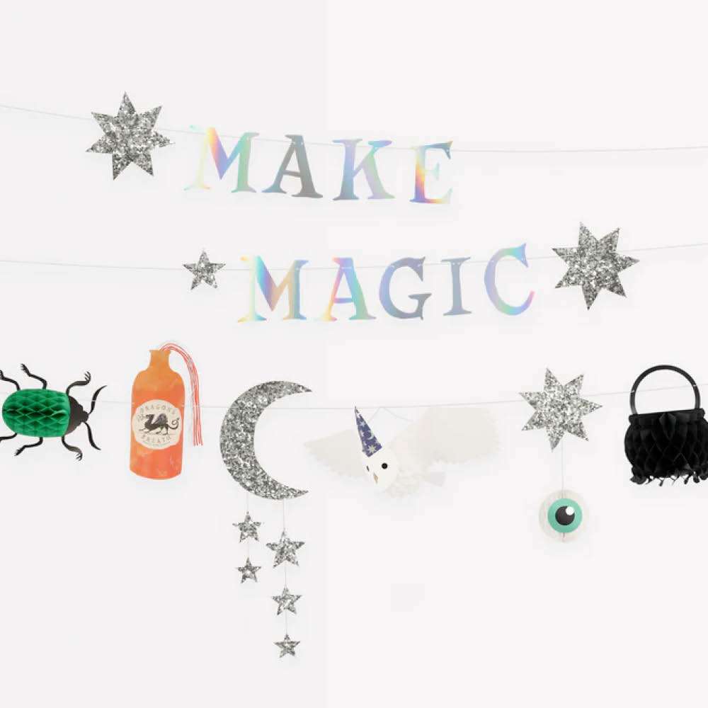 Dieses dekorative Set aus zwei Girlanden von Meri Meri darf auf der nächsten Mottoparty für angehende Zauberlehrlinge auf keinen Fall fehlen. An der Schnur befinden sich unterschiedliche magische wie gruselige Motive, die sich auch an Halloween wunderbar als Dekoration einsetzen lassen. Eine Girlande ziert der Schriftzug „Make Magic“, die andere ist von Symbolen wie einem Kessel, einem Pilz, Augäpfeln und Käfern besetzt.